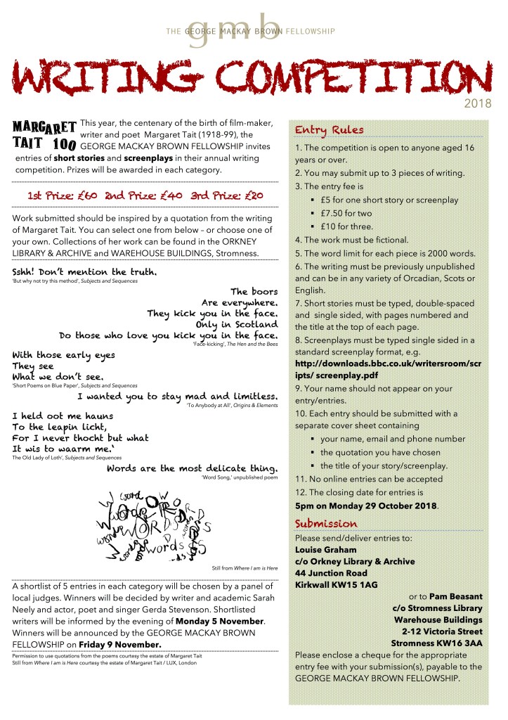 Here you can find out about our writing groups, our publications, the GMB Memorial Lecture and other activities – including collaborations and events held as part of the George Mackay Brown Centenary in 2021-2022.