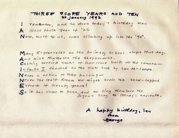 The GMB Memorial Lecture 2009, titled The Sea and the Story, was given by writer Morag MacInnes. Her father, Ian MacInnes was an art teacher, then the headmaster of Stromness Academy, and an artist. As she and her sisters grew up, George Mackay Brown was a frequent visitor in the MacInnes household. He and Ian had been friends from primary school.