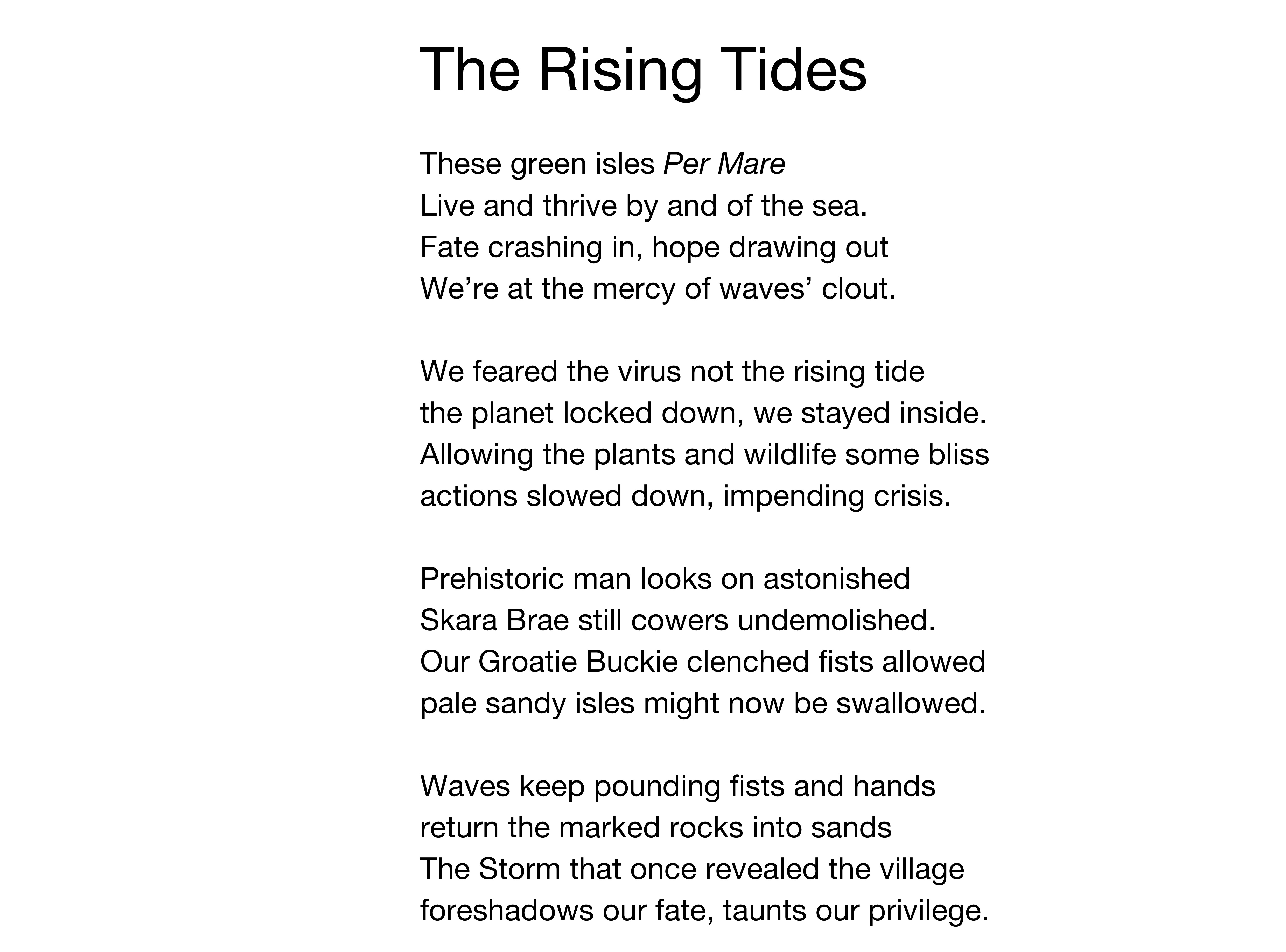 Penni Brown is originally from Stromness but now lives in Edinburgh. Previously a lawyer, she has only recently begun to write. In May she took part in our Words into Music project, a collaboration with Orkney Camerata. She submitted three poems and you can read one of them below, in which she focuses on rising sea levels due to climate change.