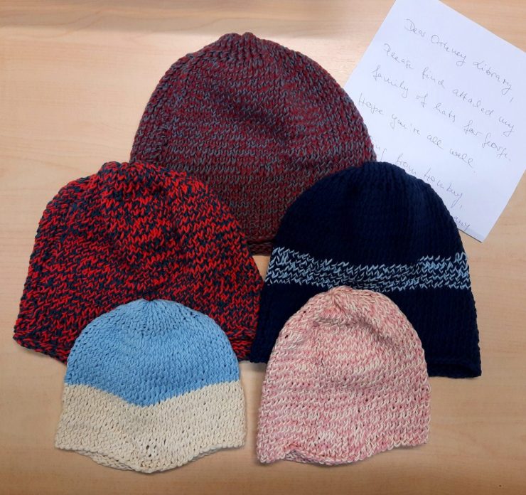 All the hats knitted for A Hat for George – an amazing total of 111 – are temporarily on display in the foyer of Orkney Library and Archive in Kirkwall. If you can’t visit this imaginatively displayed exhibition in person, have a look at the colourful walk-through exhibition here: