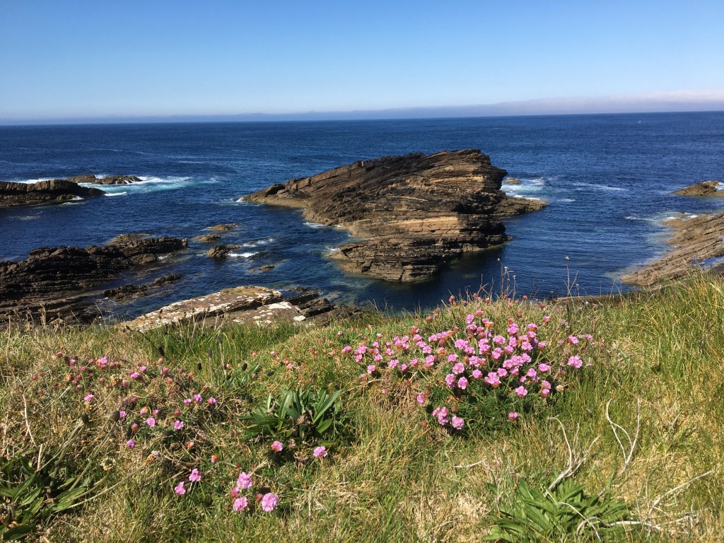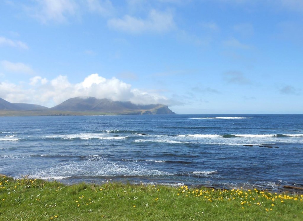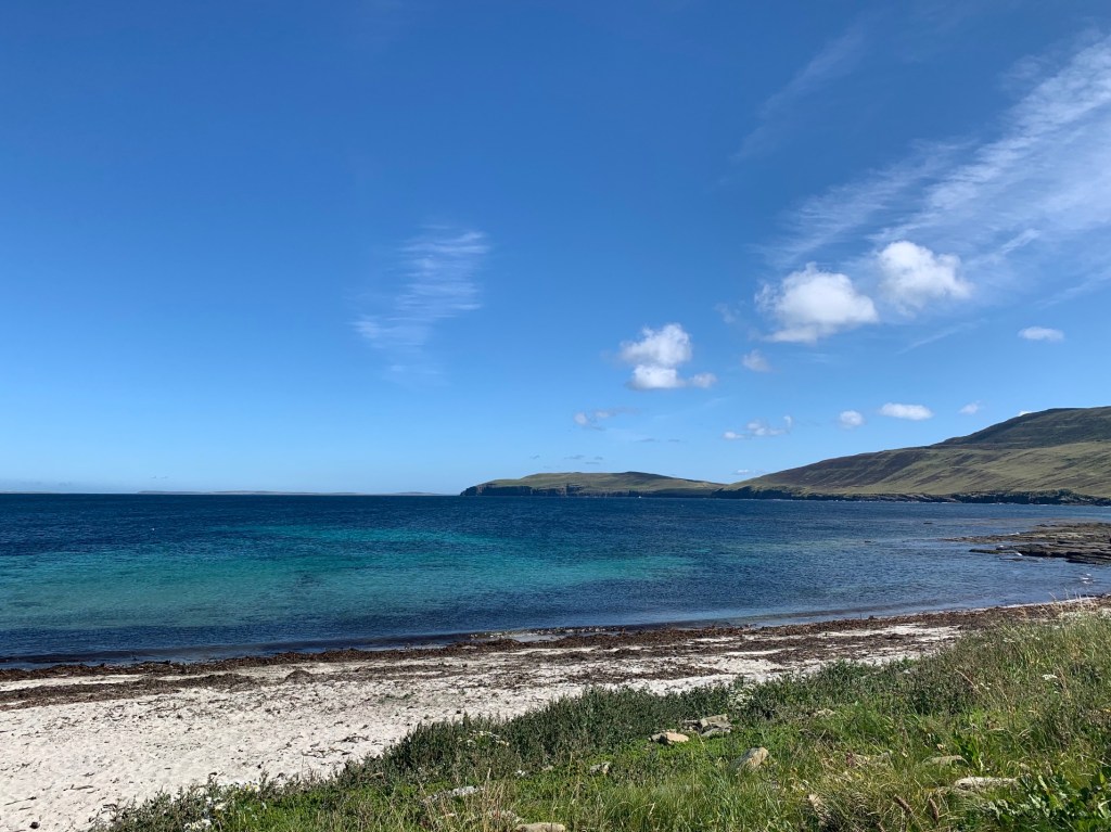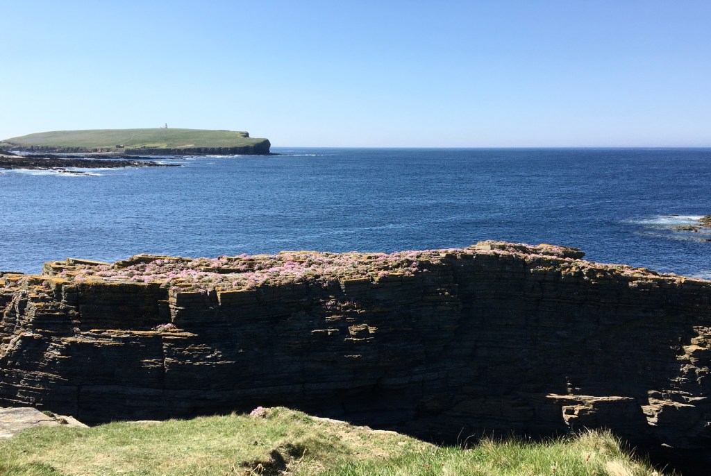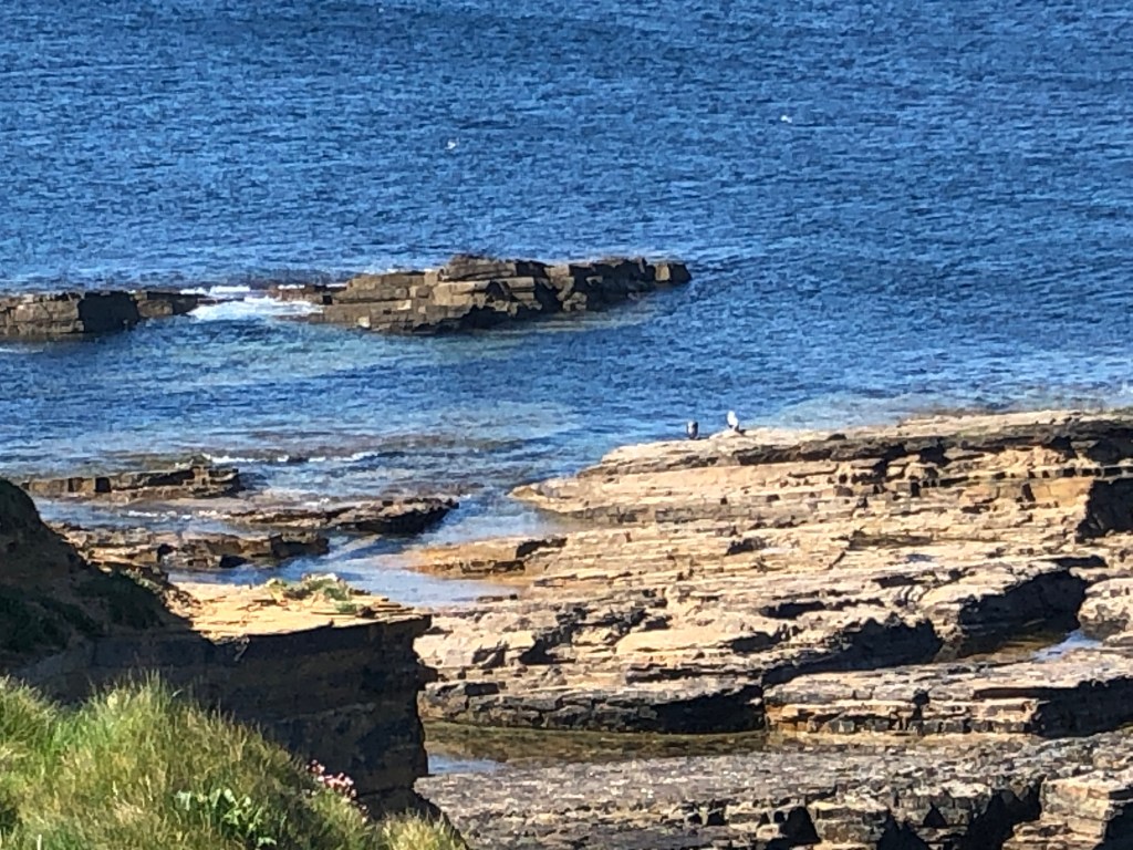 Along the road the daffodils aer past their best Doon the Gaitnip track a bee buzzes by White sheets flap and crack on Linda’s claes line A pair o’ oyster catchers fly in unison ower the field o’ breer The rutted tracks that were puddles a month ago Aer noo dry footprints in cracked relief. The vast translucent Mediterranean blue sky contrasts Wi’ a deep whale blue sea The tide is oot, the beds o’ kelp glitter in the efternoon sun. Daisies, lesser celandine, yarrow, soldiers wound wort Pepper the tufted gress beside weel trodden Paths devoid o’ vegetation. No sign o’ picky ternos at The Castles yit bit Two eider drakes squabble ower a lone female Mallimaks sit singly or in pairs Their raucous caals echo on the Skiba Geo cliffs While ithers freewheel on the updraft like kites Larks chorus, peedie specks hoveran high above. The shore road on the wey back is dry and dusty Dandelions makan their first appearance along the verges Sheeps wool clings on tae the shire wire fence Half an ‘oor o’ blissful solitude, a daily tonic.