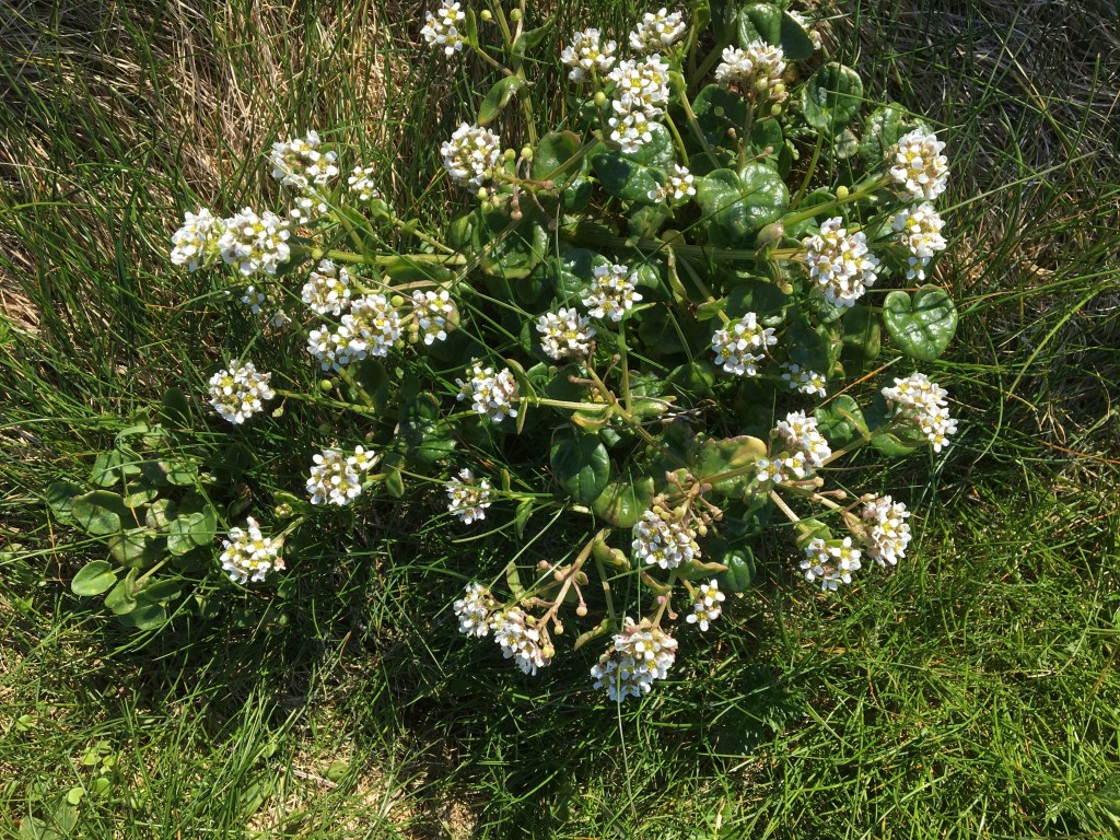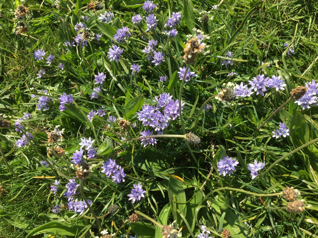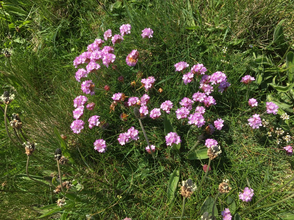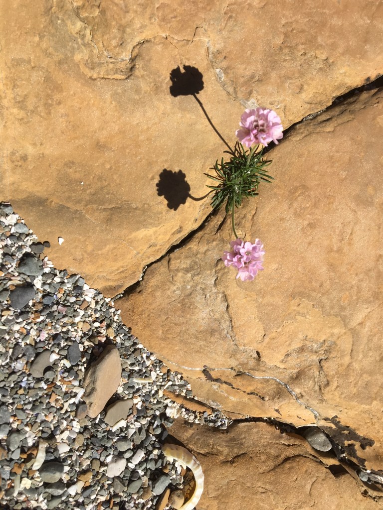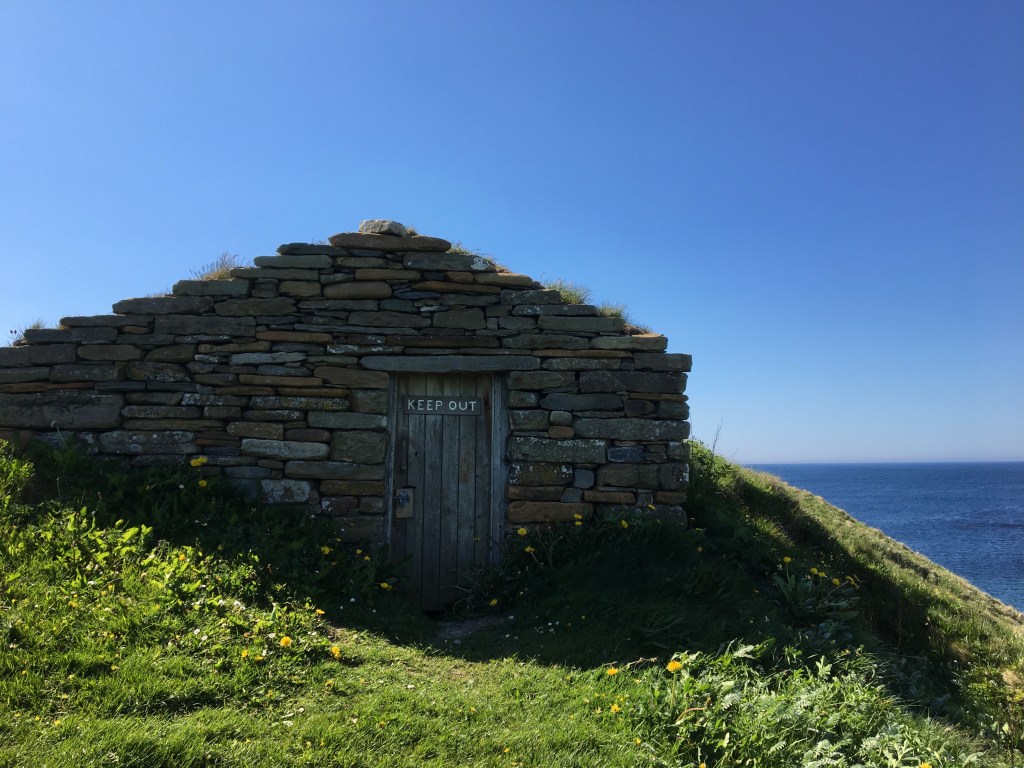 Along the road the daffodils aer past their best Doon the Gaitnip track a bee buzzes by White sheets flap and crack on Linda’s claes line A pair o’ oyster catchers fly in unison ower the field o’ breer The rutted tracks that were puddles a month ago Aer noo dry footprints in cracked relief. The vast translucent Mediterranean blue sky contrasts Wi’ a deep whale blue sea The tide is oot, the beds o’ kelp glitter in the efternoon sun. Daisies, lesser celandine, yarrow, soldiers wound wort Pepper the tufted gress beside weel trodden Paths devoid o’ vegetation. No sign o’ picky ternos at The Castles yit bit Two eider drakes squabble ower a lone female Mallimaks sit singly or in pairs Their raucous caals echo on the Skiba Geo cliffs While ithers freewheel on the updraft like kites Larks chorus, peedie specks hoveran high above. The shore road on the wey back is dry and dusty Dandelions makan their first appearance along the verges Sheeps wool clings on tae the shire wire fence Half an ‘oor o’ blissful solitude, a daily tonic.