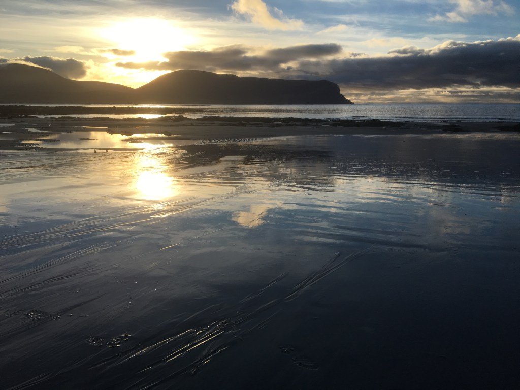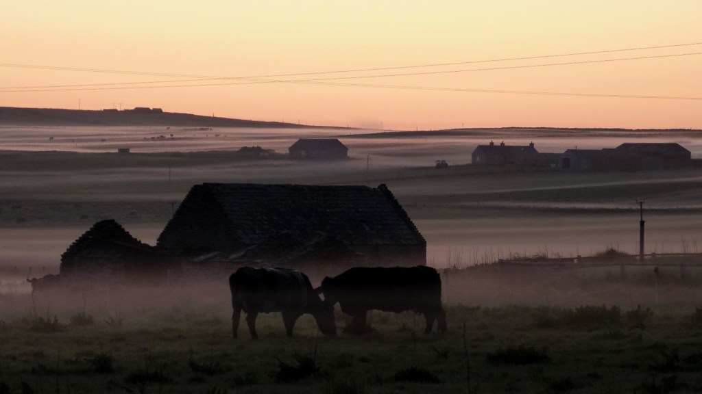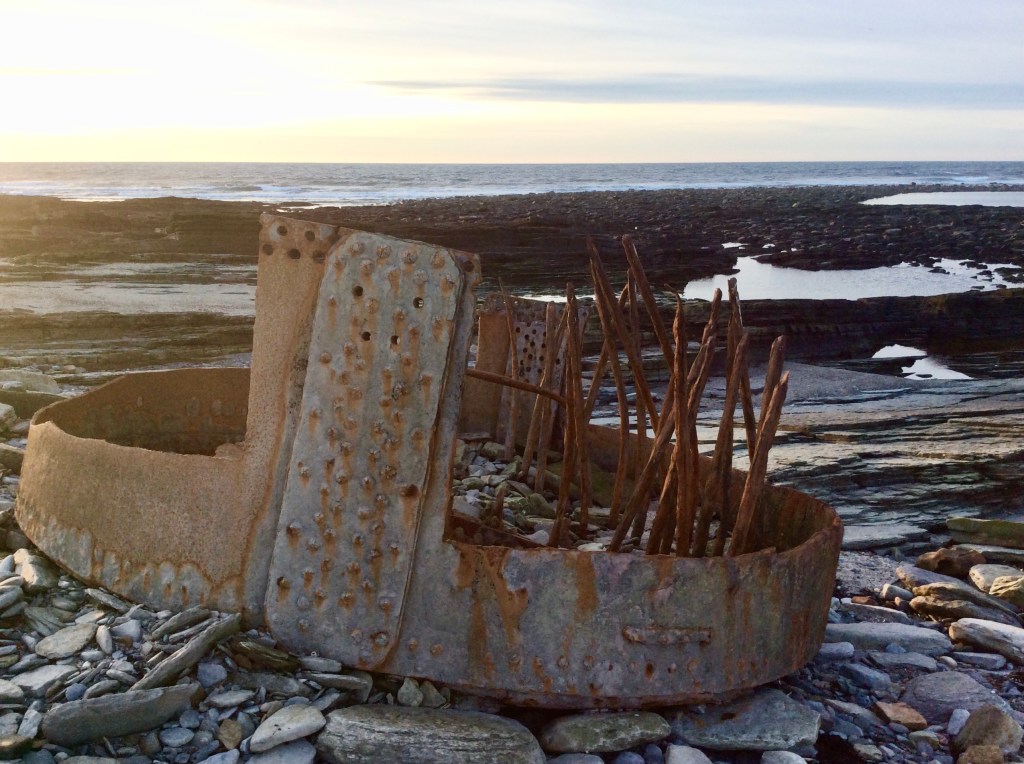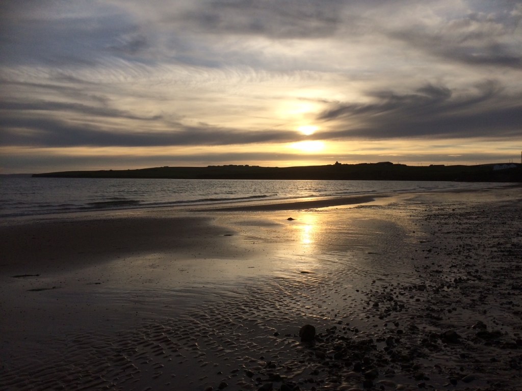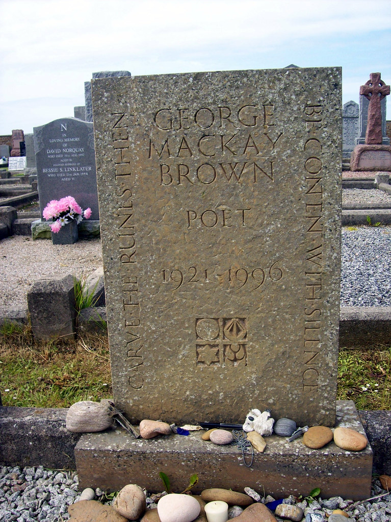 No one did I ken in that kirkyard They stood aloof in thir weel tended lairs A place o comfort for many but not for me. We met beside the kirkyard wall Some folk I kent, some unkan tae me, walking the road tae the shore, a distance between us no only in feet, my accent broadest of all. The shore when reached ower gress and stones wis a place o beauty and serenity in this mad world, the Hoy hills so near I could almost reach oot and touch thim. Comfortingly close tonight. The film crew – weel a slight exaggeration! – guided us throo the movements, and laughter and sadness mingled beside the cowld blue-black sea. Fingers numbing wae the sinking sun Oil lamps and torches noo lit for the final shots, a feeling of bonding taegither tae dae wir best. Wid George feel this love o his wark vibrate throo rock, gress and earth tae his eternal bed? Or wis he here wae is? So here I stood on Warbeth shore as Kittag, waiting and hoping beside the dark sea that my man Peter would be washed ashore and I would find him dead, dead like my feelings for him. Only then could my life start again, without fear and toil and sadness. Hid felt that night like we stepped back in time something so timeless in a wey the power o the sea, the hills o Hoy darkening and looming bigger the darker it got. The rhythm o the waves broken only by the caall o the eider ducks silhouetted against the dying light in the west as they cam home tae roost. And there we stood reluctant tae leave till the cowld made is shift. Torches and lamps lit wir path and voices and accents mingled taegither as we cam tae the kirkyard wall, and whar before I thowt I kent no one, I stopped and whispered thank you tae a man I'd nivver met.
