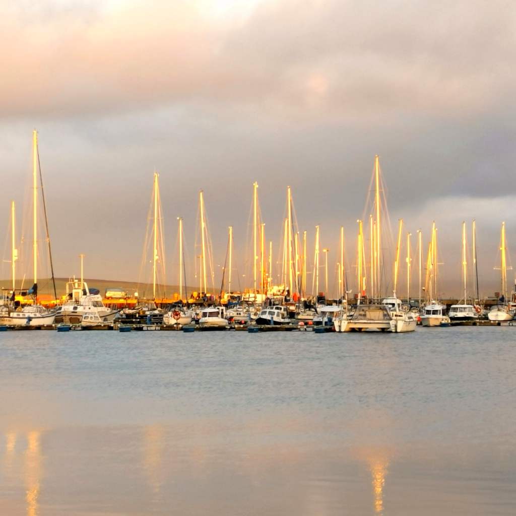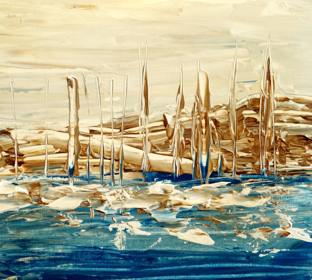 The watur culur sun splashes oan wind vanes, flashan in sync high ubun the decks whar the whitemaas dance. Rock-a-bye bots whistle a selkie maelody, an’ sweengan halyards tip-tap the rhythm oan swayan mainsail masts. A lazy Northerly swael rolls in by the breakwatar while shimeran hulls tug oan thur tethurs, tormented bae the push an pul o’ the sea. Lorraine Bruce September 2020