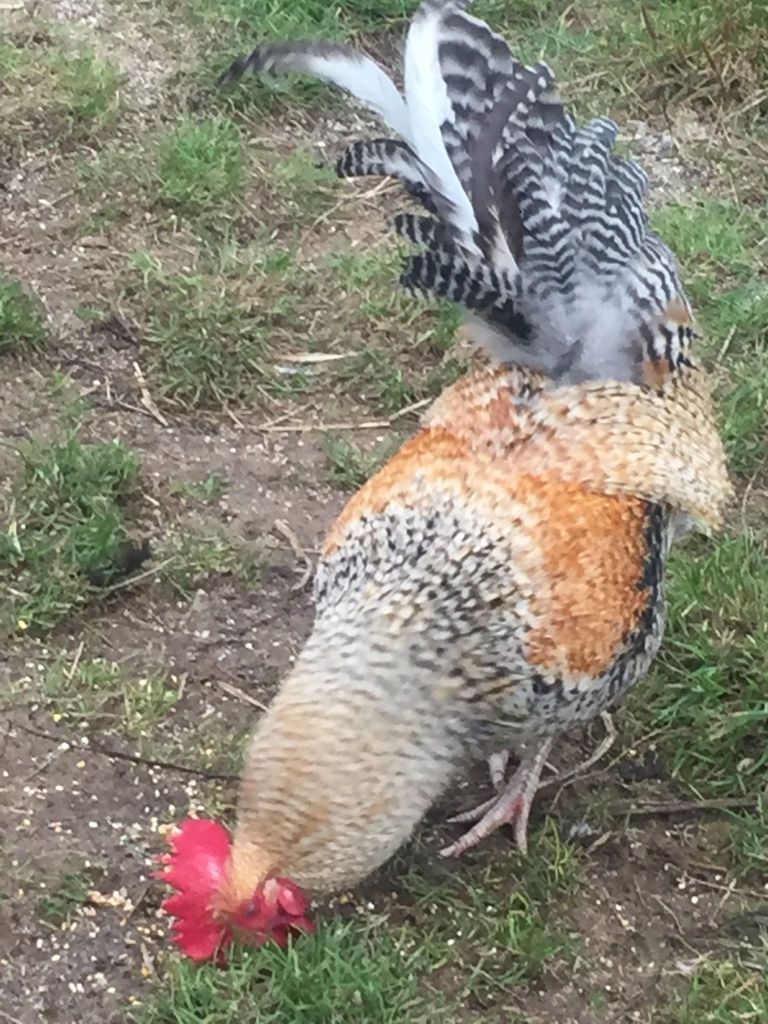 Aye weel ye might glare at me, me handsome owld boy, bit yir lukkan yer age, there's no mistake and weel past yer use by date. I need a younger model, a different blood line, and I doot yiv reached the end o yir time. You've strutted your stuff for many a day, dazzled and kept us amused wae your antics as king o the yerd Dinna luk at me so, as hid’s brakkan me hert to see you gettan owld and frail Yer crow more a squawk in yer throat and the feathers fallin out o yer tail. The lasses all gether aroond, dae they sense sometheen's amiss? I reach doon tae grab you, a flurry o faethers an I cradle you closs tae me breist. I plant a wee kiss on yer heid. Forgive me I whisper as I bend doon and tighten me howld on yer neck chist as me granny used tae dae I thraw yir scrawny owld neck Noo all is quiet, the deed is done. the lasses go fendan for worms while I'm left wi notheen more tae dae bit tae bury me poor deid cock.